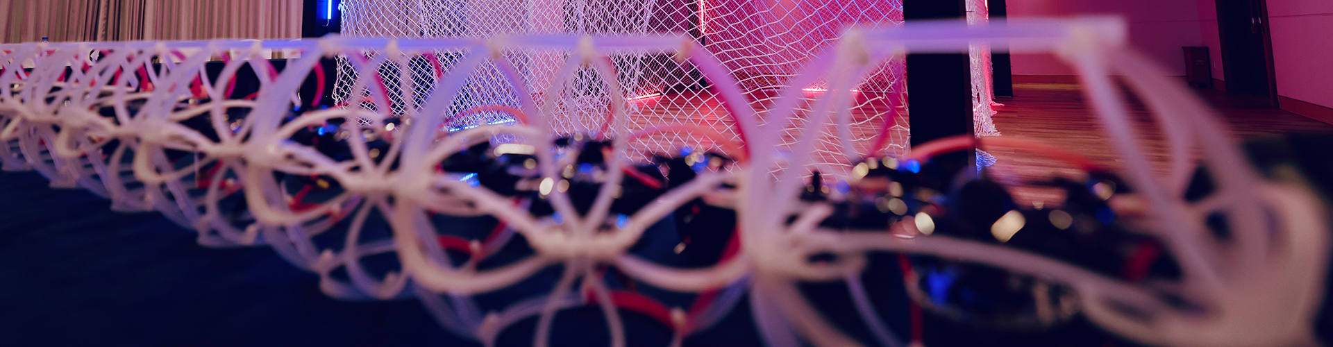 一套足球无人机网架套餐包含:6*3*3米的防护网和两个感应圈门用于布置比赛及活动场地,为保证赛事正常进行,必须使用防护网保证飞行安全。基础套装包括:(1) 尼龙织布材质的保护网,拉伸强度高;(2) 金属立柱和安放底座,经久耐用;推荐使用24V固定电源或者3S 3000mAh或以上容量的电池供电固定电源供电可选12V或24V电源供电,功率最低保证在60W以上如电池电量不足或电源电压异常,灯圈将会以红