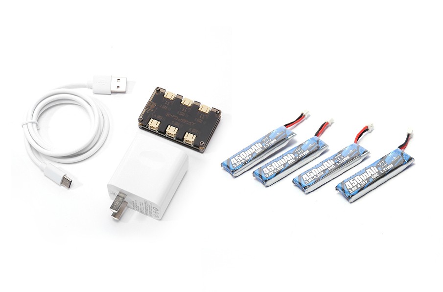 畅飞套餐(小飞匠)包含电池管家(数据线+插头+一拖六充电板),4块1S 450mAh 电池